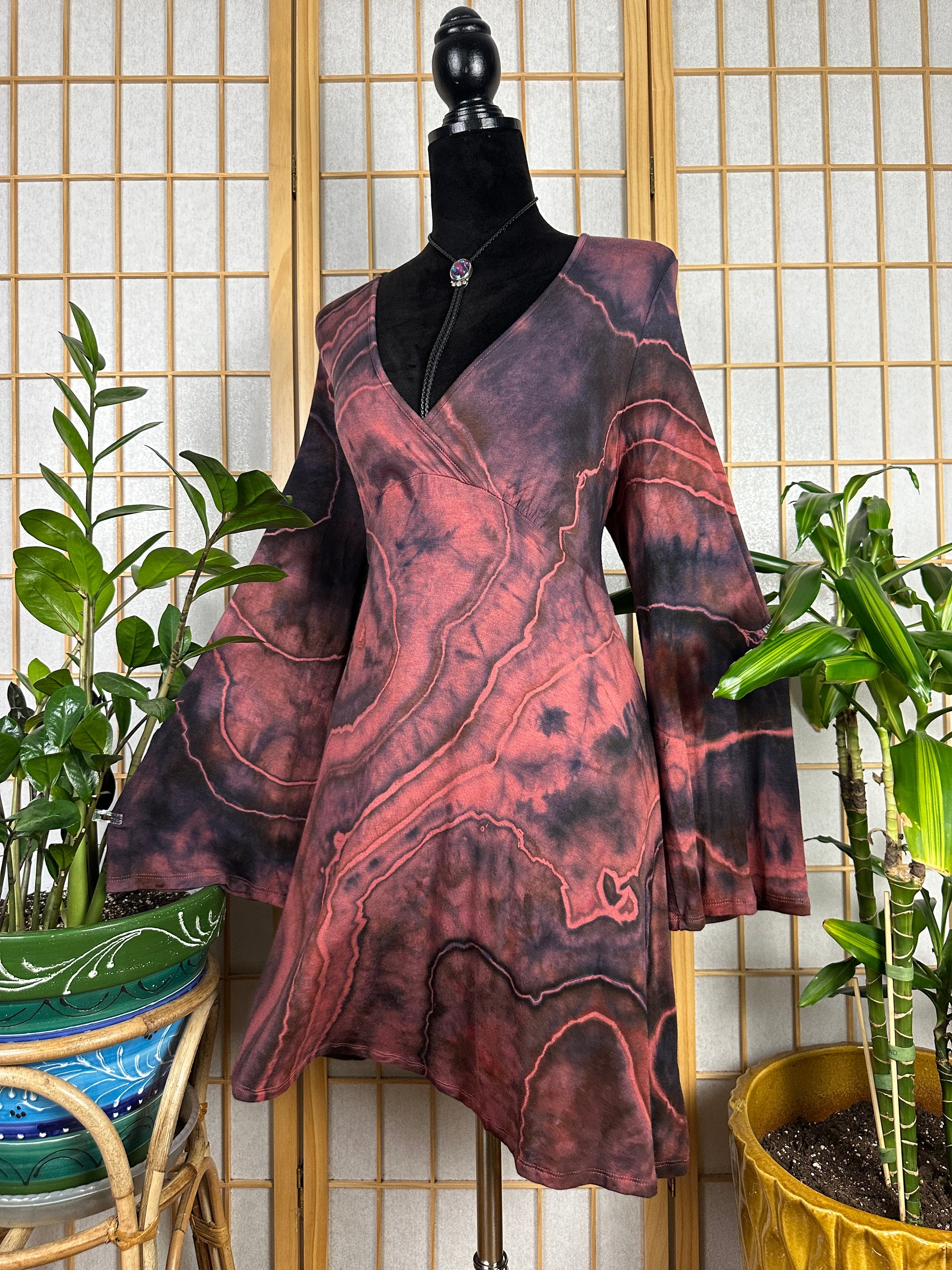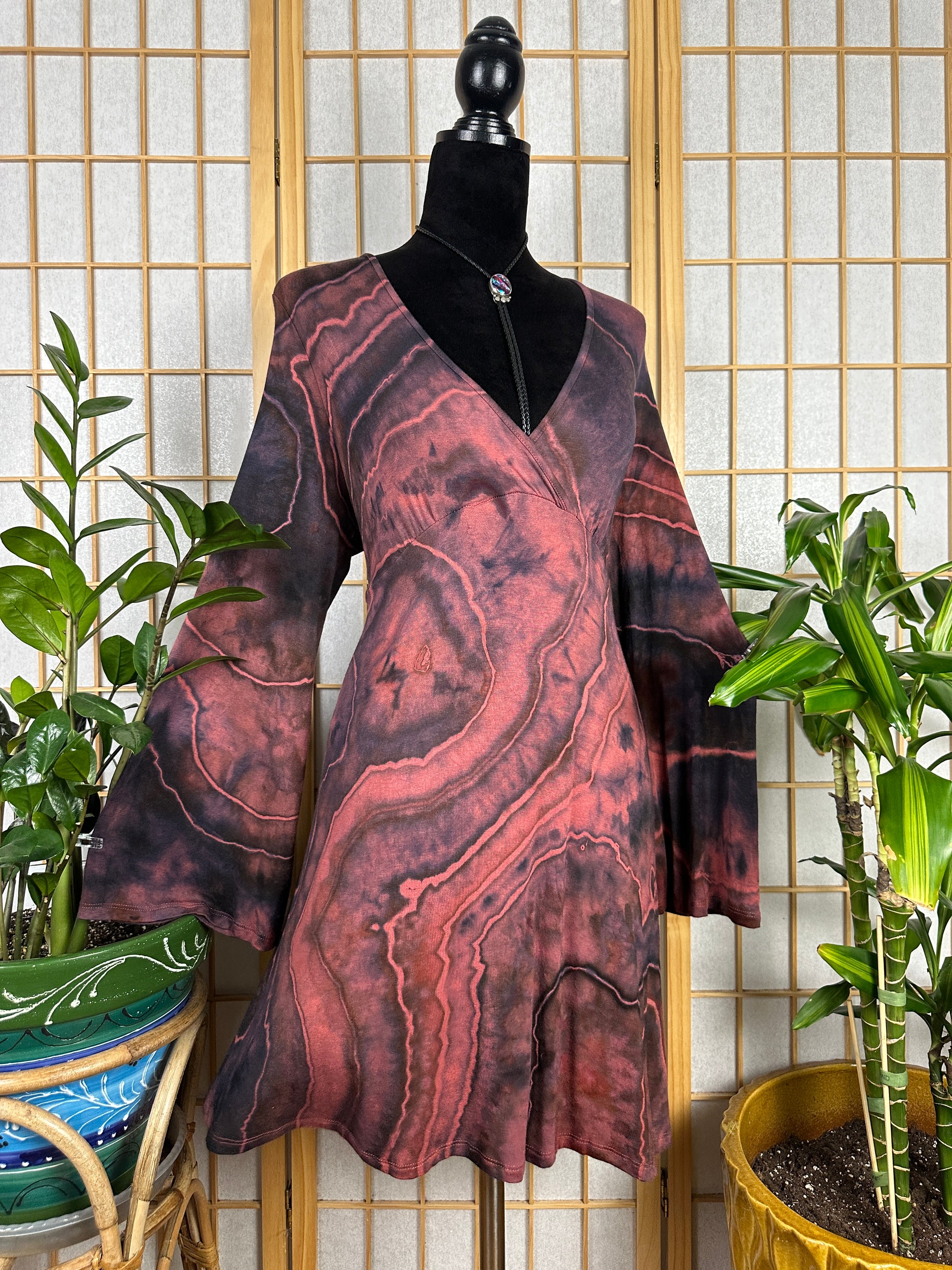 This dress is made of a stretchy rayon fabric and it's mini length. This dress is low cut and runs true to size.