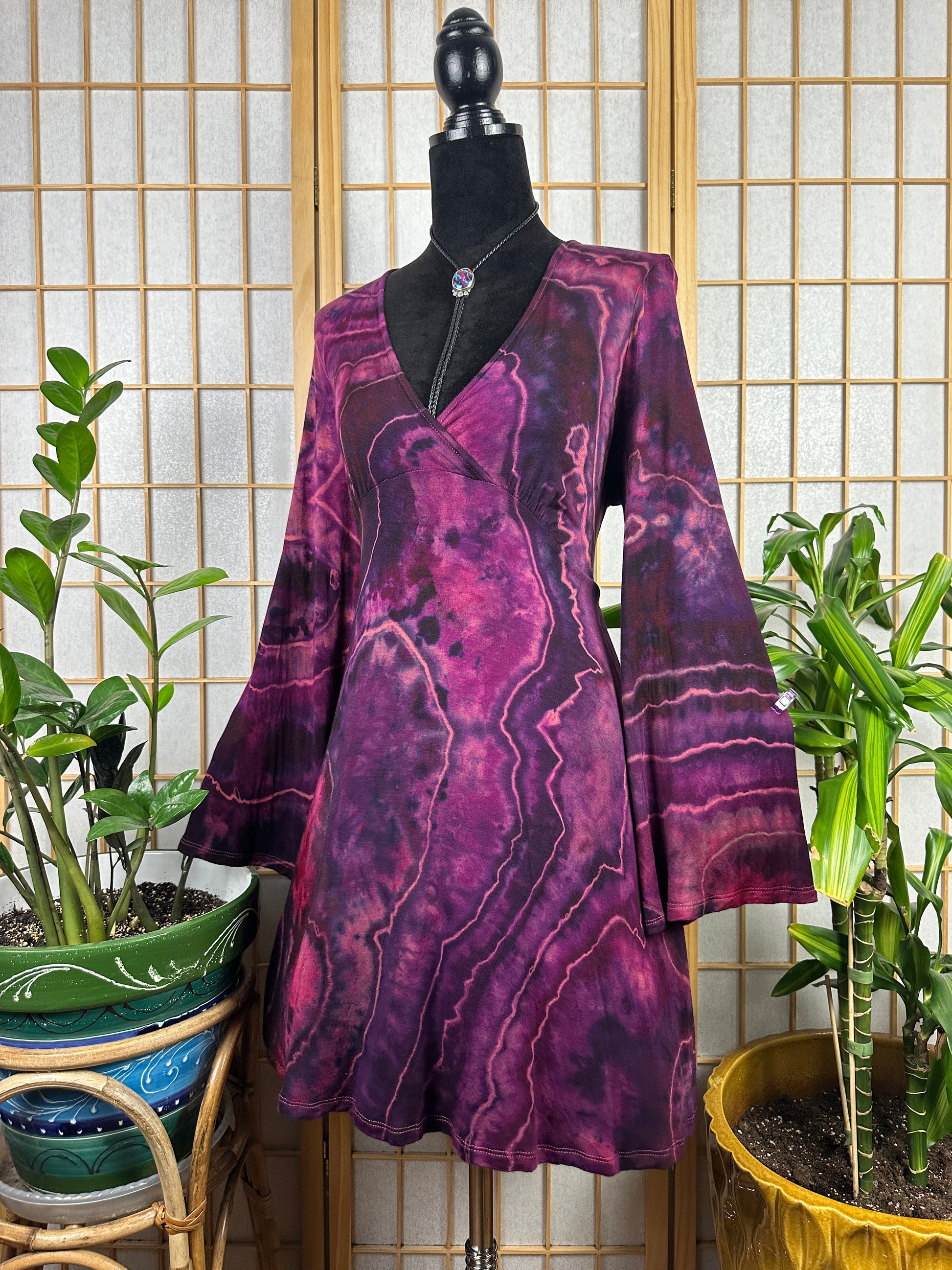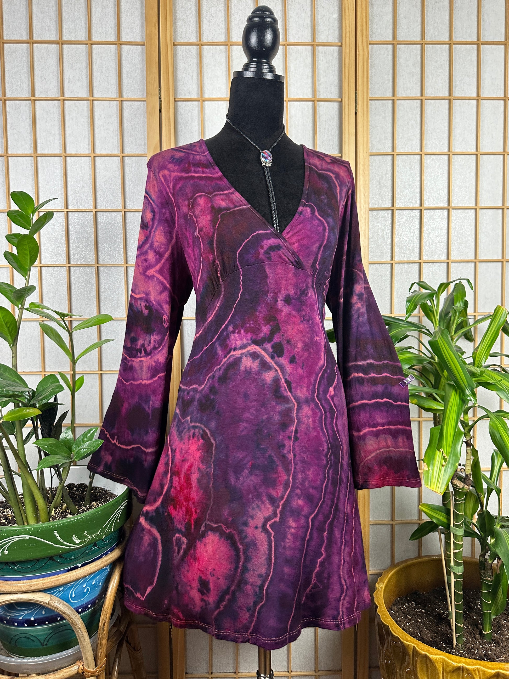 This dress is made of a stretchy rayon fabric and it's mini length. This dress is low cut and runs true to size.