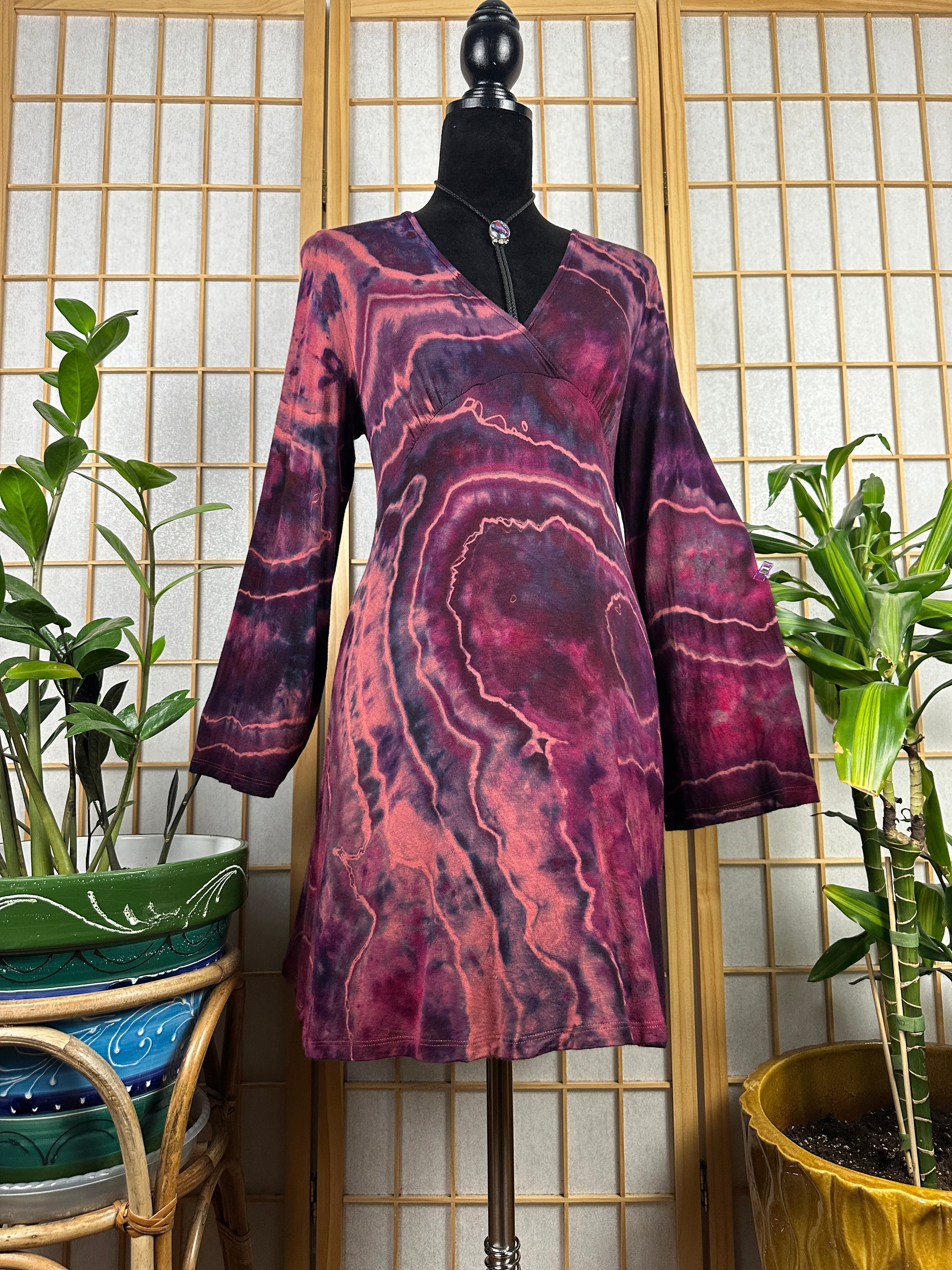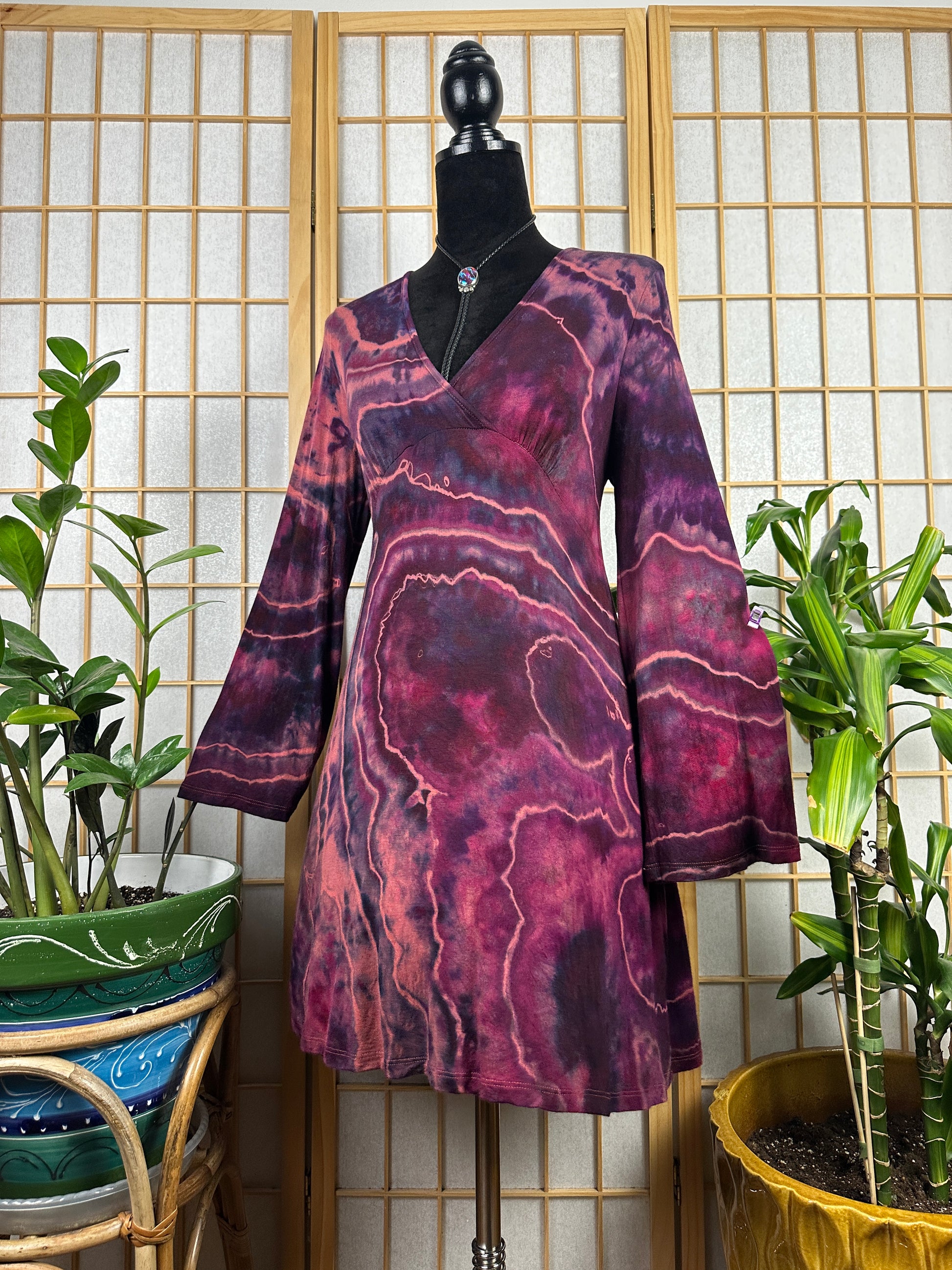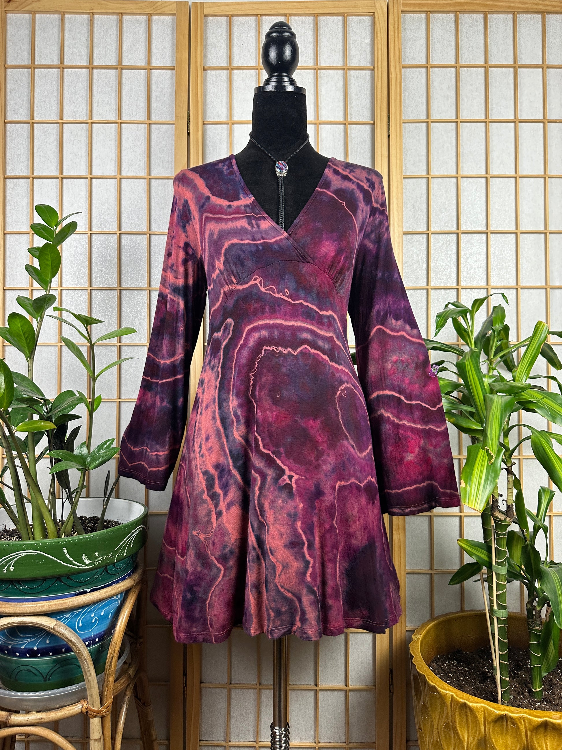 This dress is made of a stretchy rayon fabric and it's mini length. This dress is low cut and runs true to size.