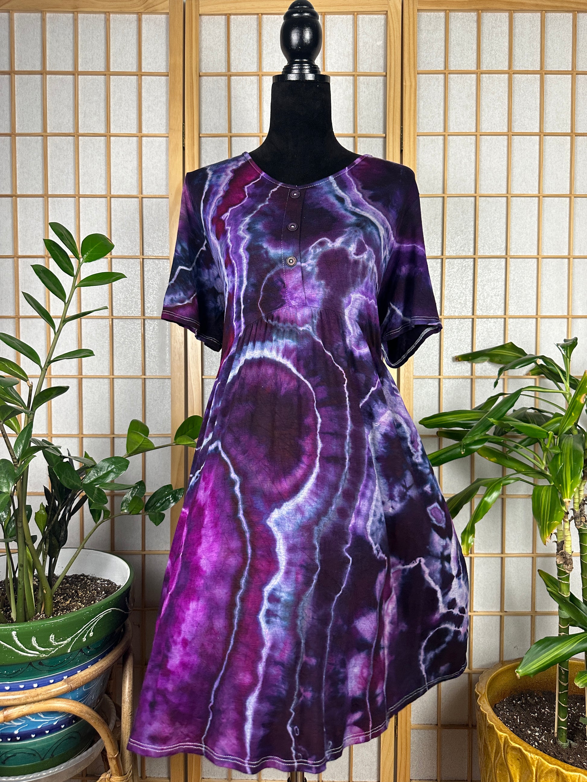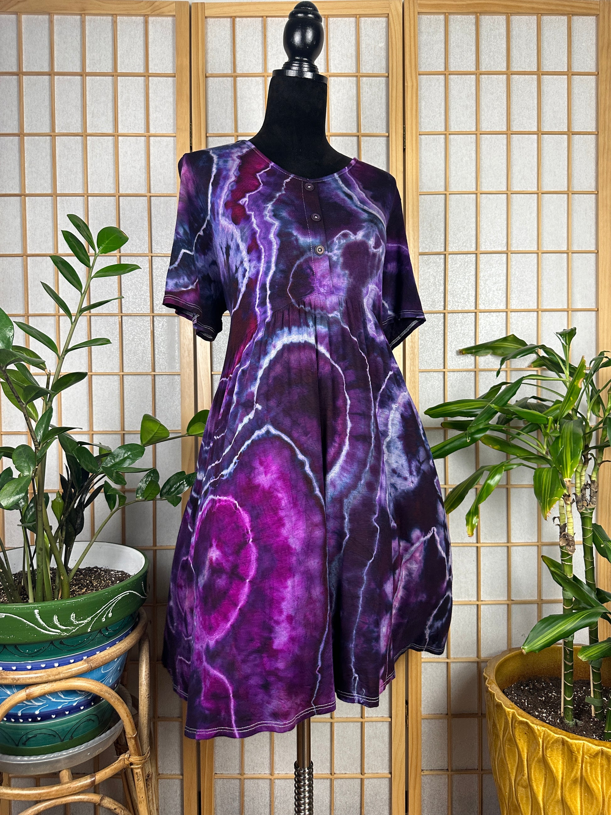This dress is made of a stretchy rayon fabric and it has pockets! This style runs true to size with a lot of wiggle room and the skirt lands around the knee.