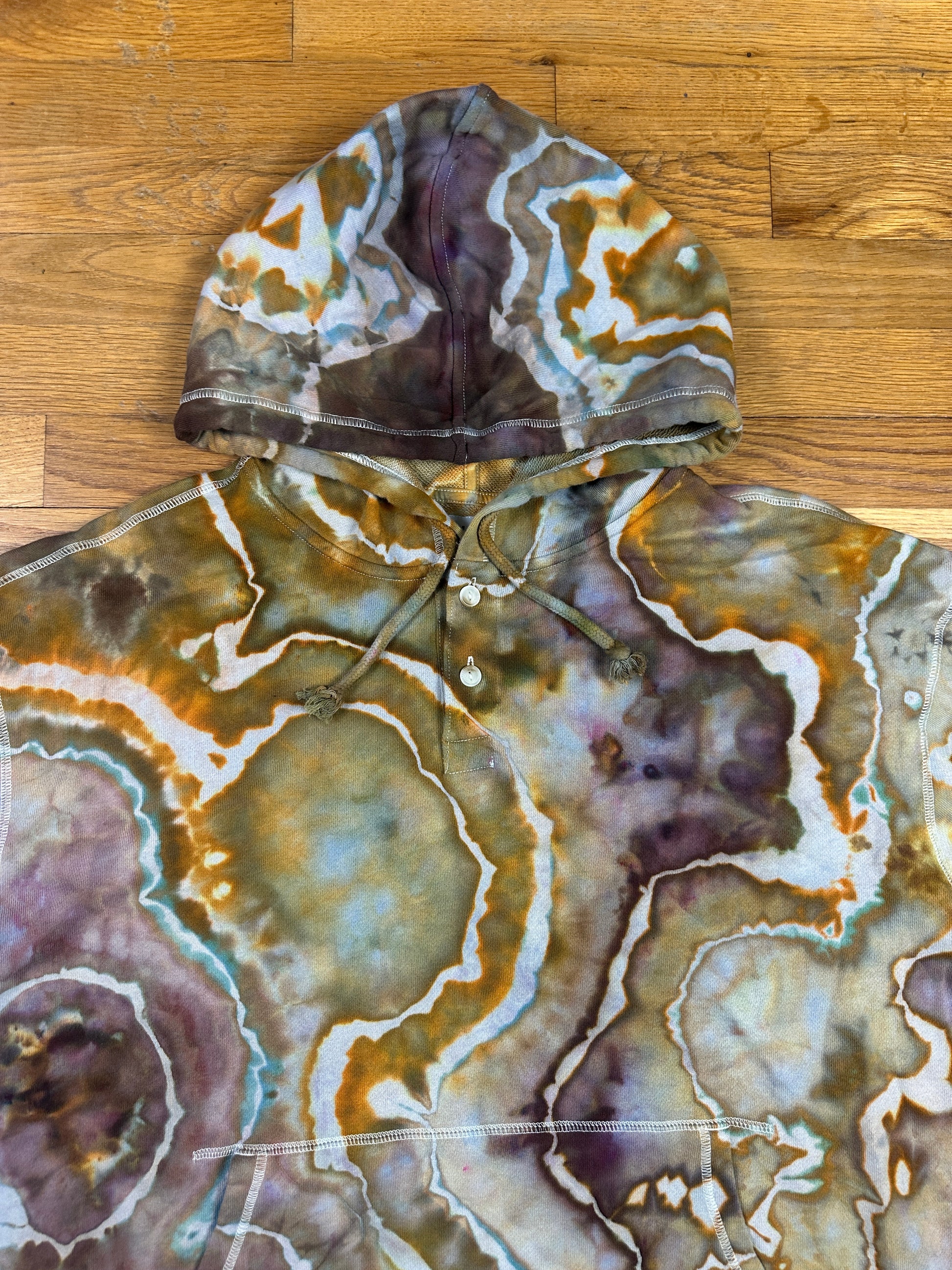 This hoodie is made of 100% cotton sweatshirt material and has a drawstring hood and button closure.