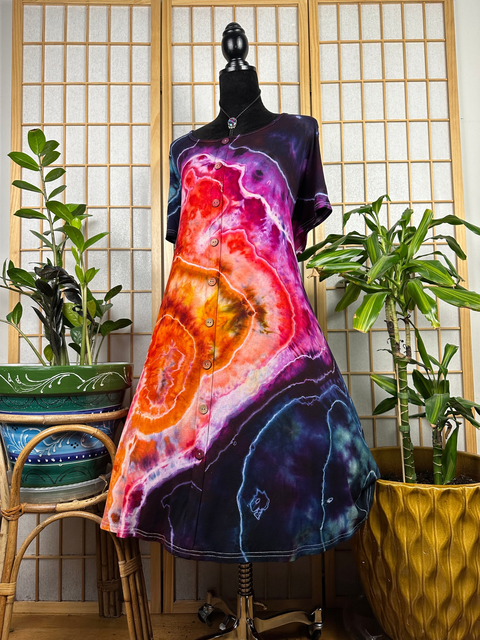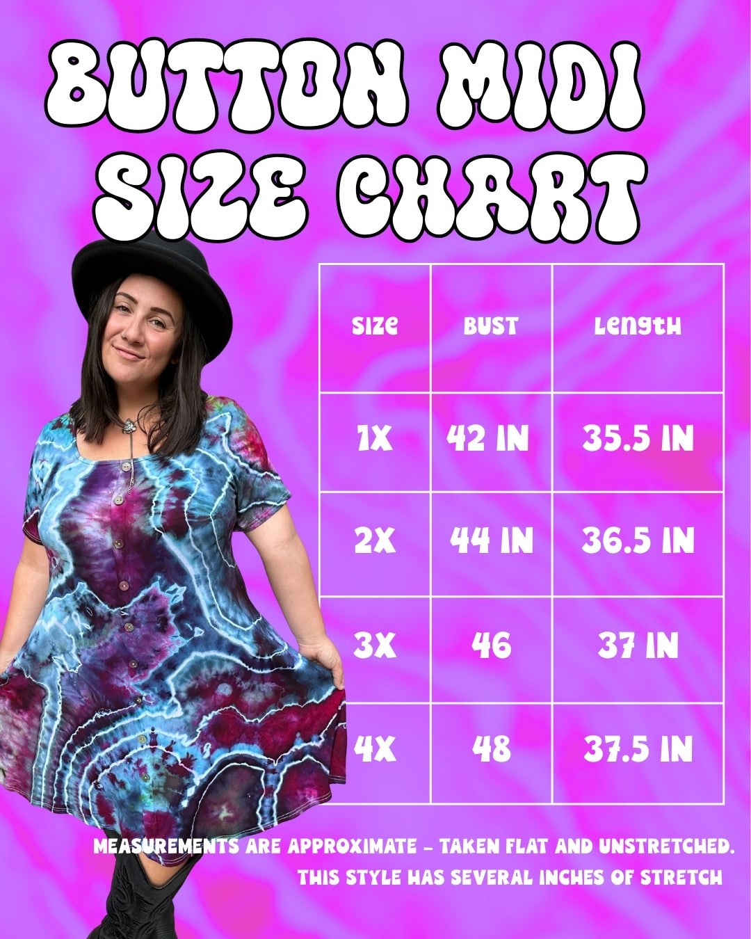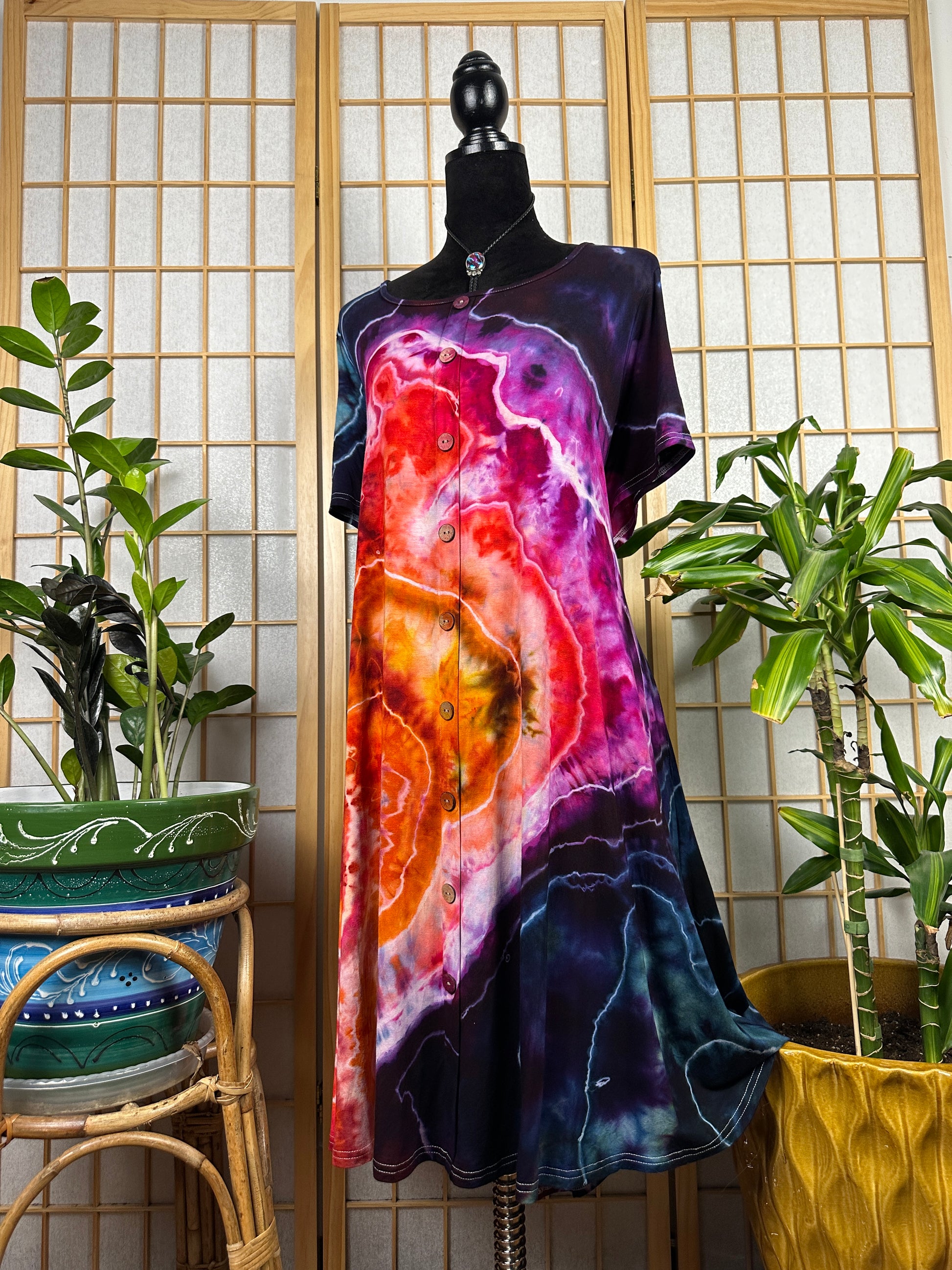 This dress is made of a stretchy rayon fabric and it has POCKETS! The buttons down the front are decorative (no wardrobe malfunctions) and the skirt lands below the knee. This style runs true to size