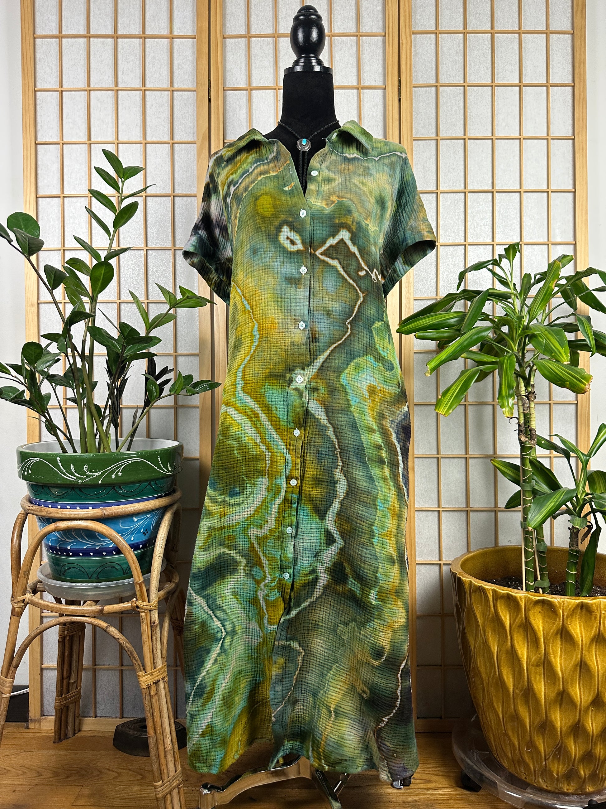 This dress is made of a soft, durable cotton fabric and it has pockets and buttons all the way down the front. This dress is maxi length with a rounded hem and the fit is relaxed.