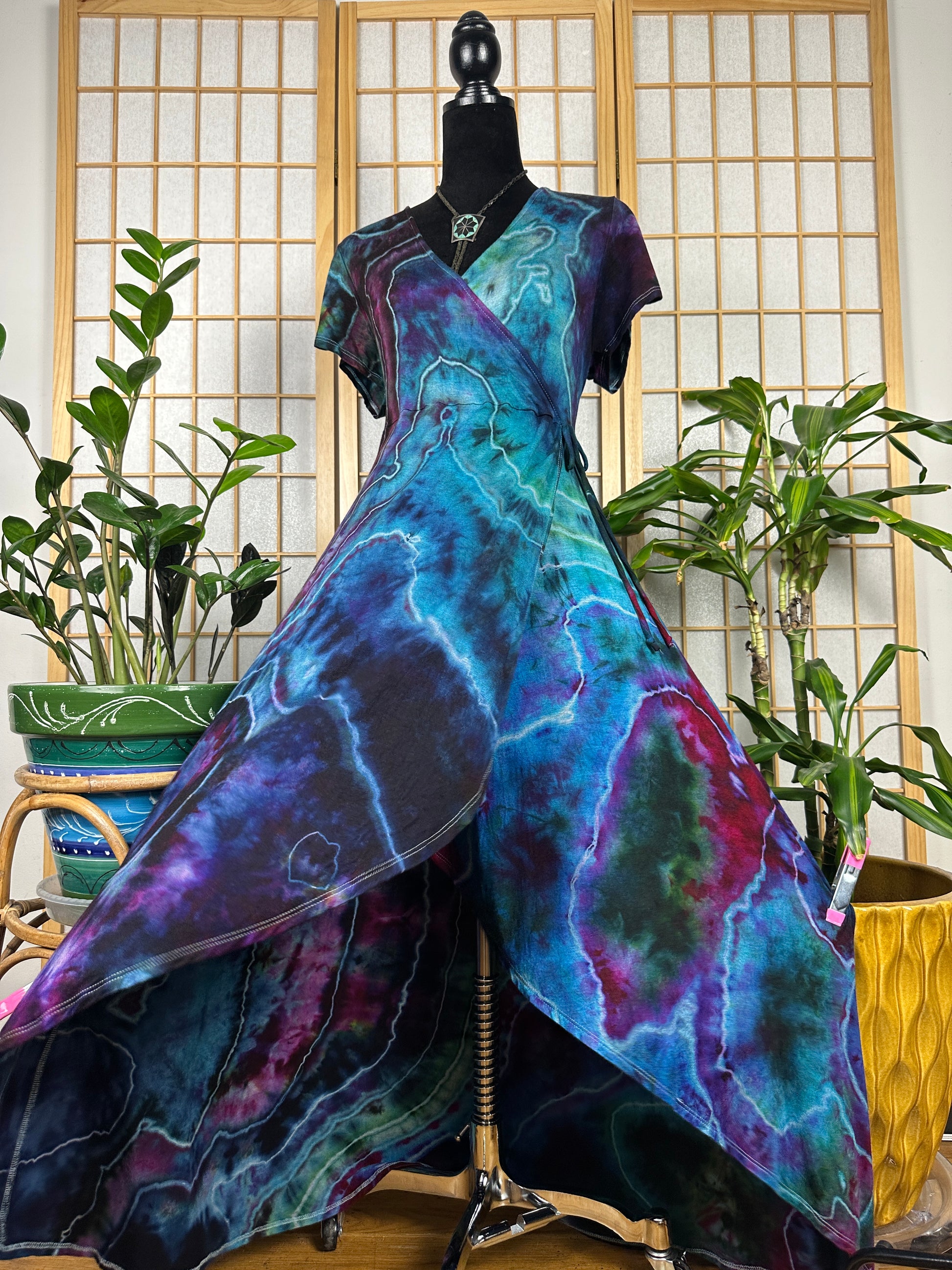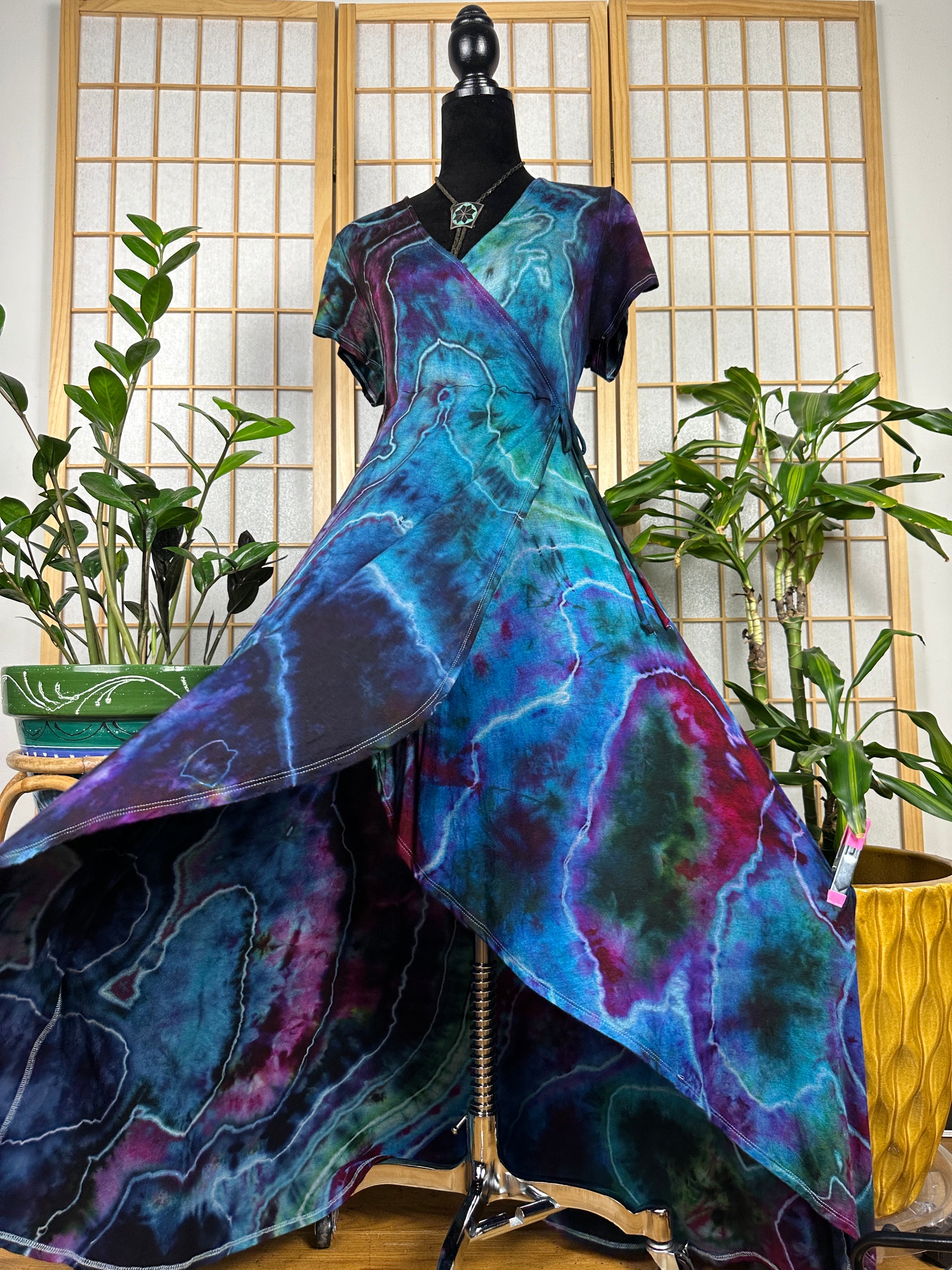 This dress is made of a stretchy rayon fabric and it has a faux-wrap fit. This style runs a bit on the roomier side, allowing for lots of wiggle room between size.