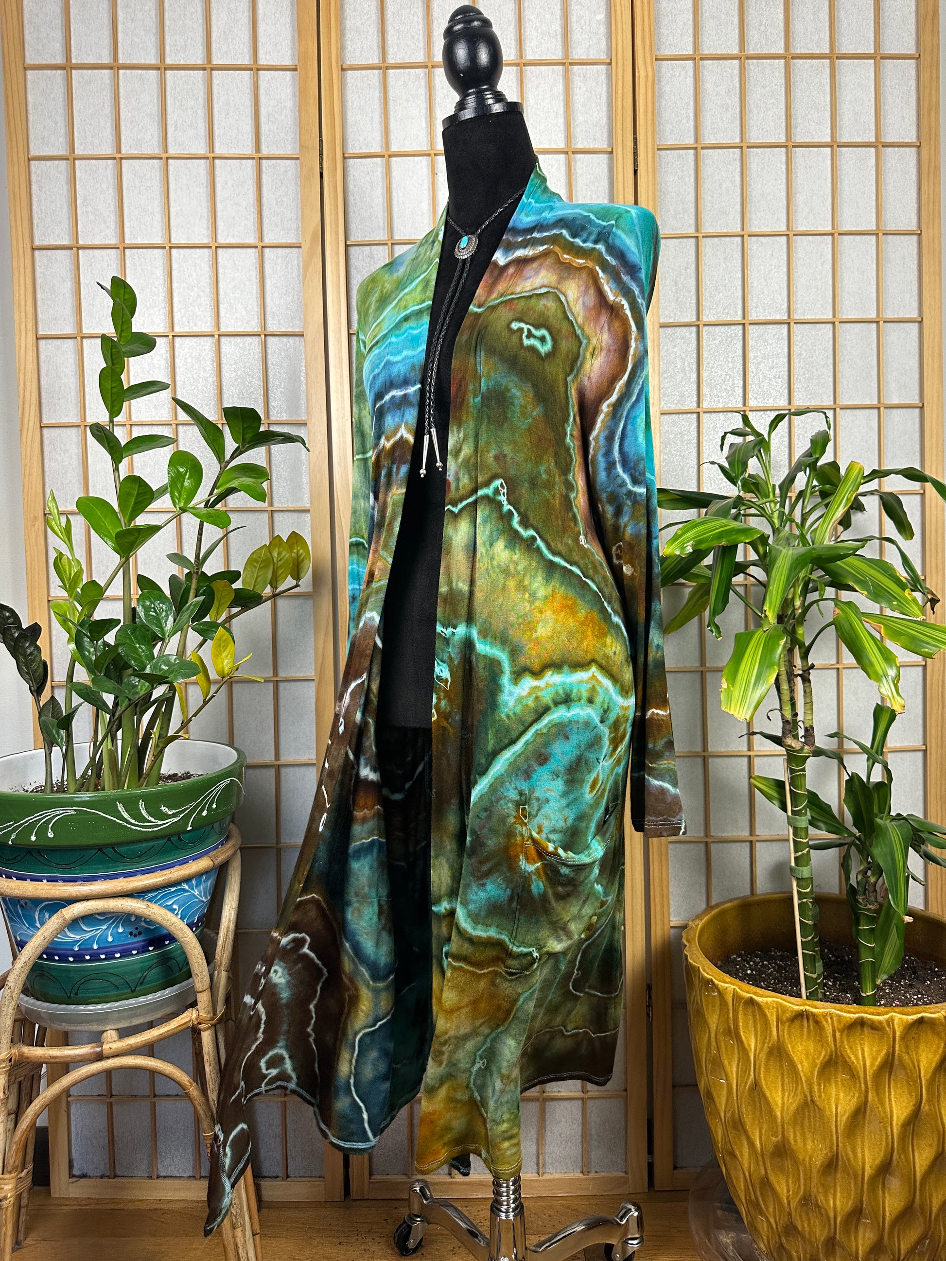This duster cardigan is made of a soft, stretchy material that is 95% rayon/5% spandex. It has 2 deep front pockets and it lands below the booty