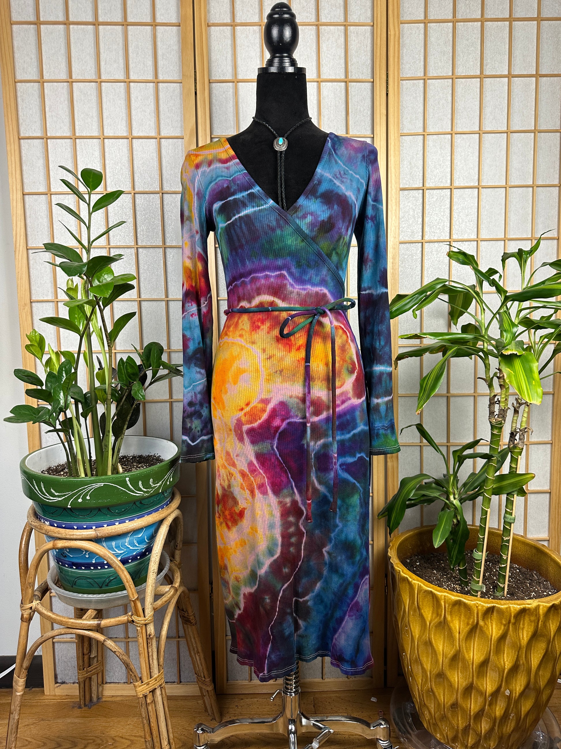 This dress is made of a stretchy ribbed cotton/rayon fabric. It has a faux wrap look and an adjustable belt. This style runs pretty form fitting so if you want a little extra room - size up!