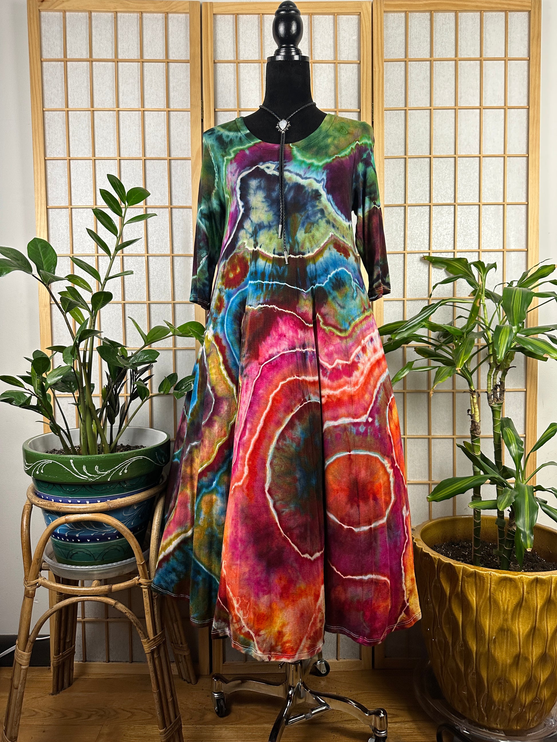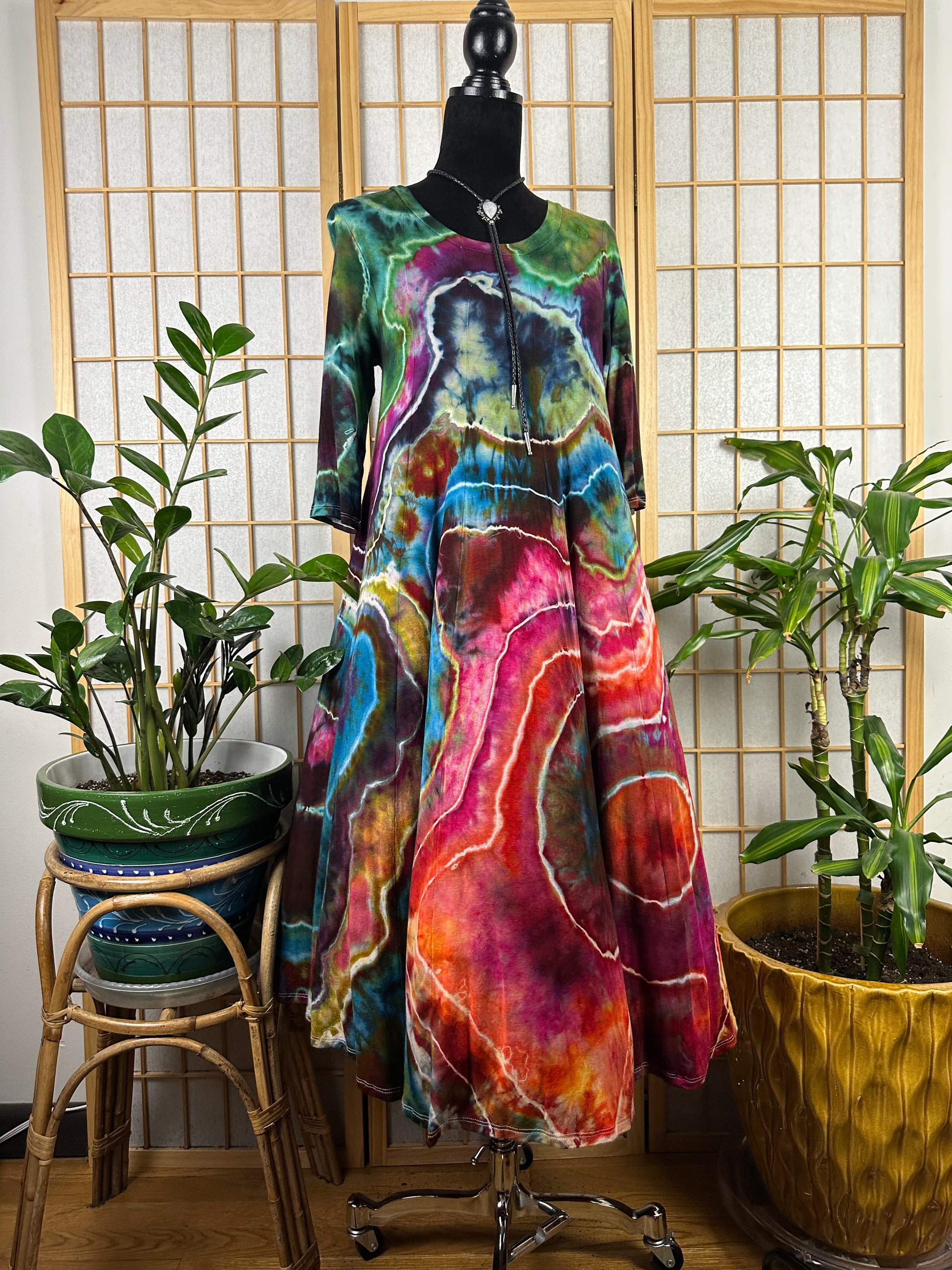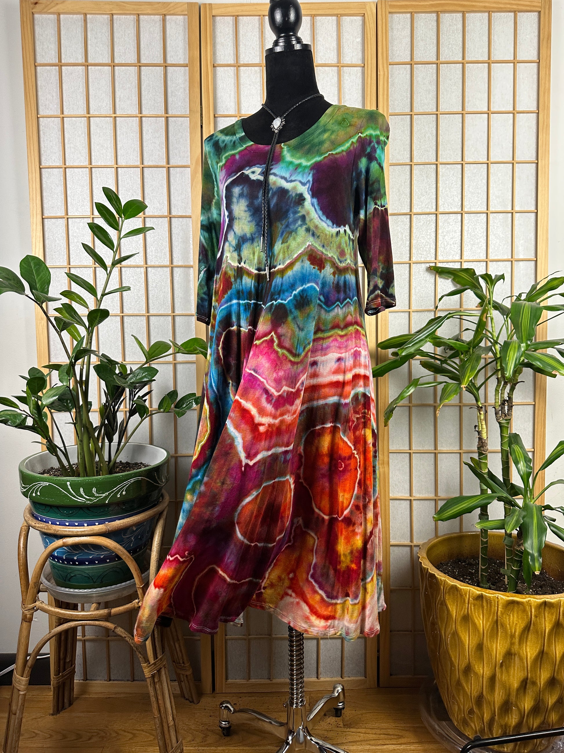 This dress is made of a light stretchy rayon and it moves like a dream! This one has 3/4 length sleeves and is longer midi length. Runs true to size with a lot of stretch and a roomy fit through the middle.