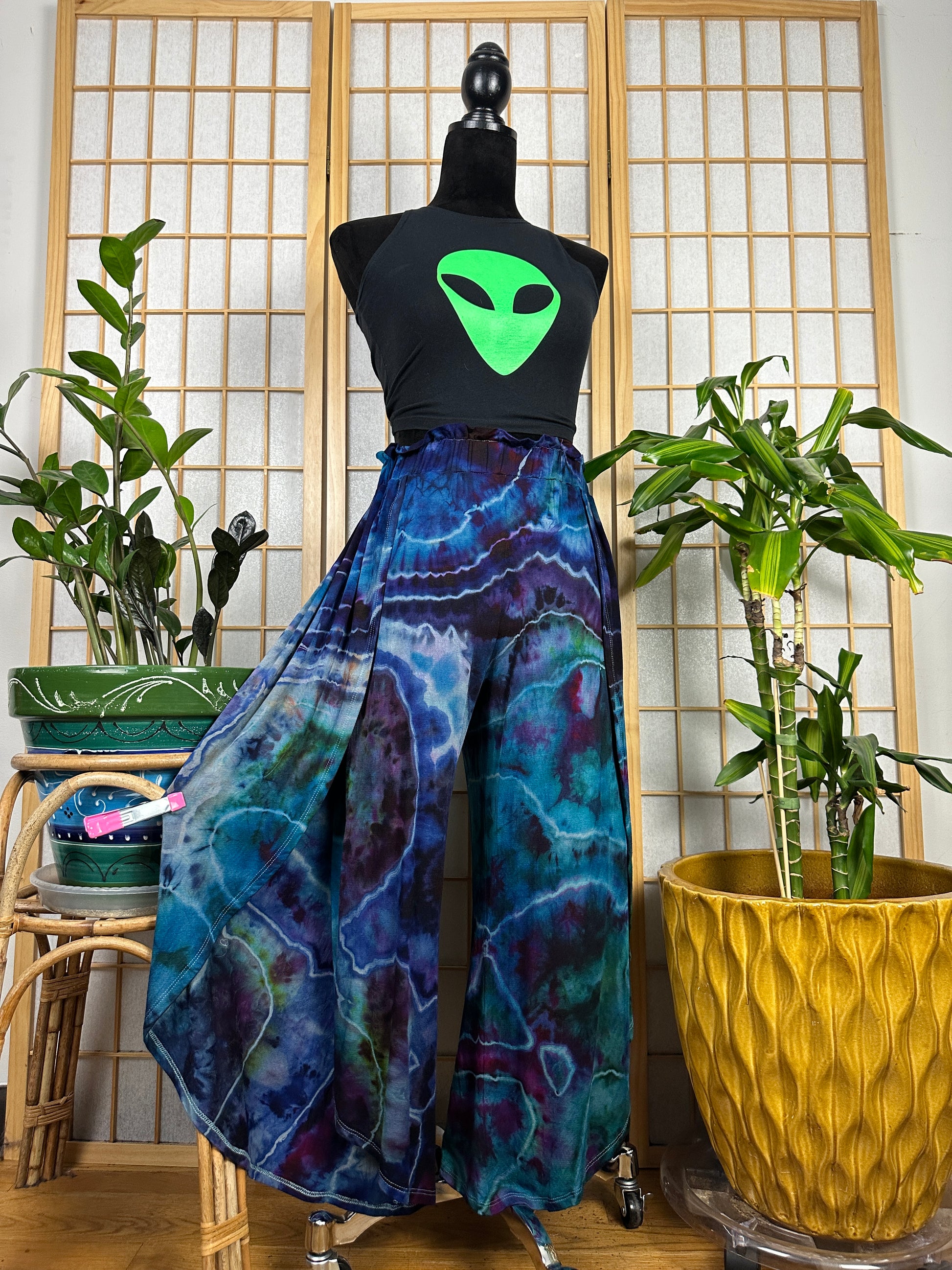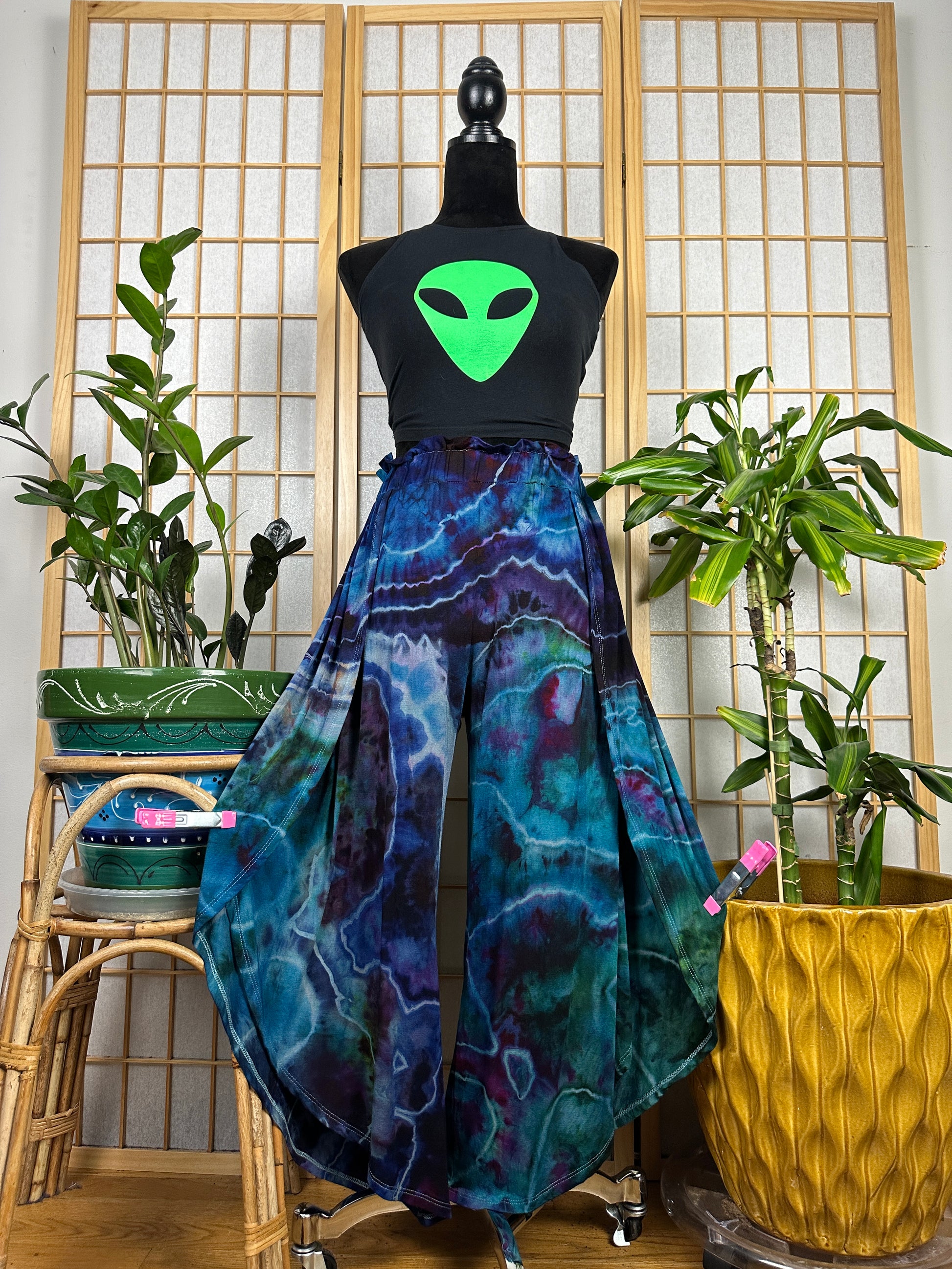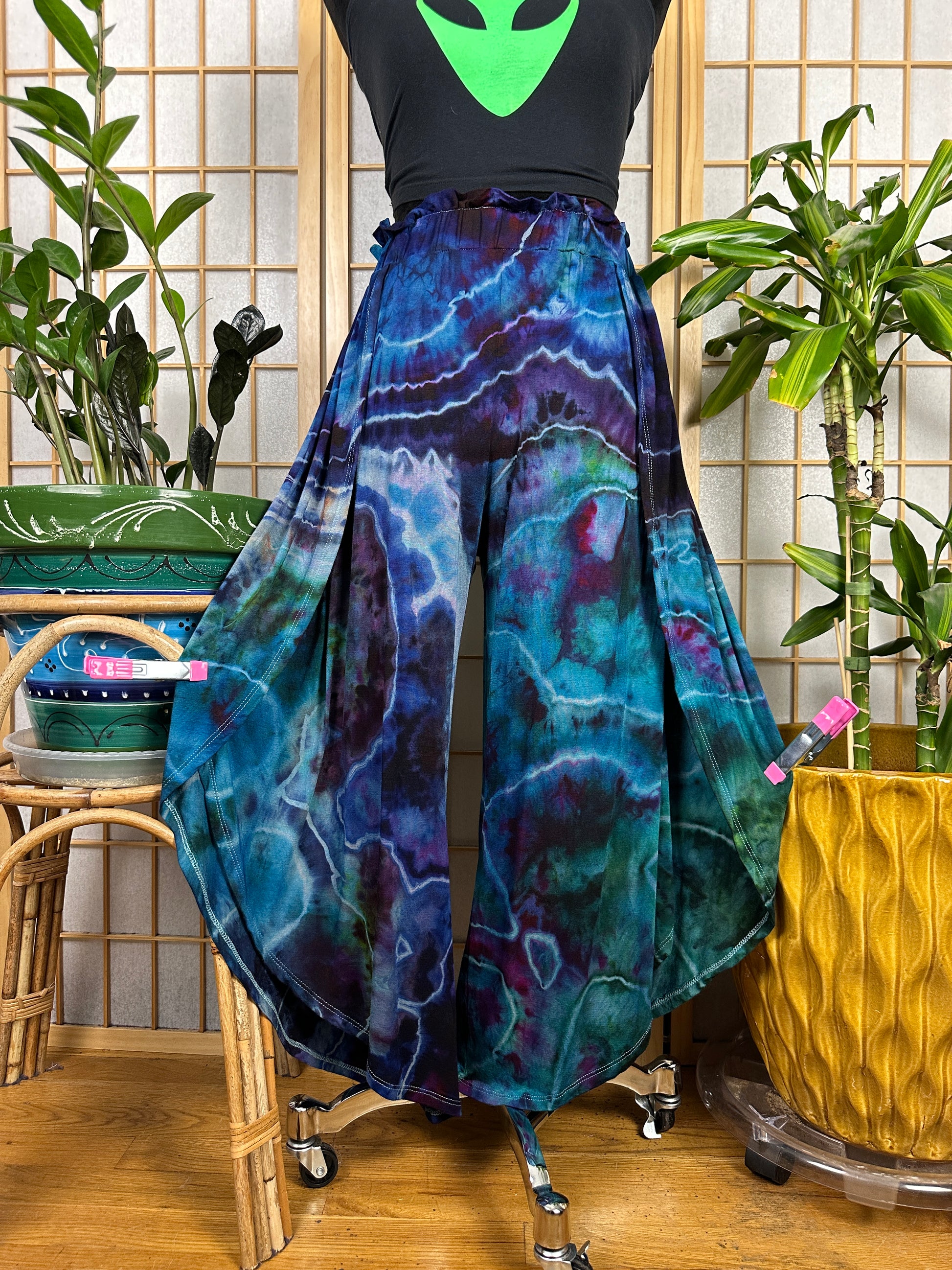 These pants are made out of a stretchy rayon fabric and they split open in the front for a flowy look. They have a wide internal elastic waistband and are about 35 inches long in the back.