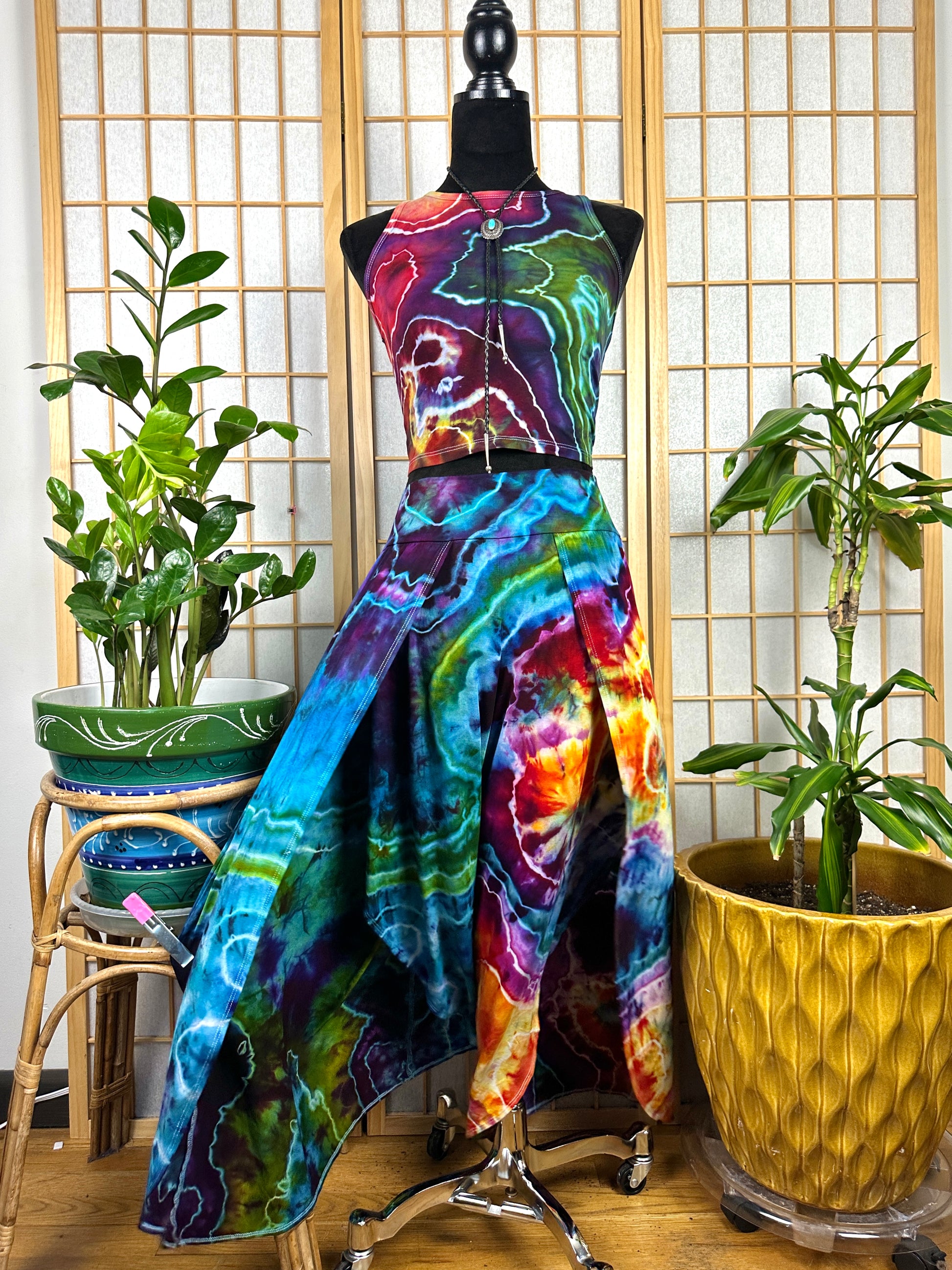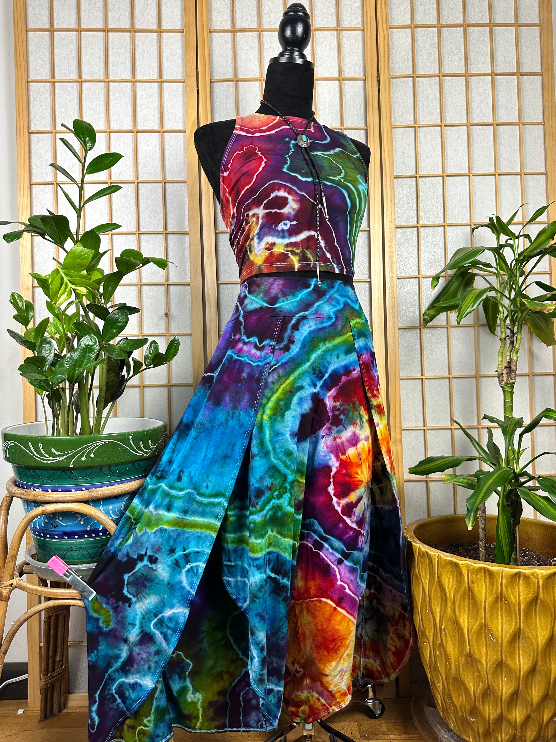 These pants are made of 95% viscose/5% spandex and they have a wide comfy waistband that can be worn high on the waist or lower on the hips. The pant legs have a split hem in the front and they run longer in the back.