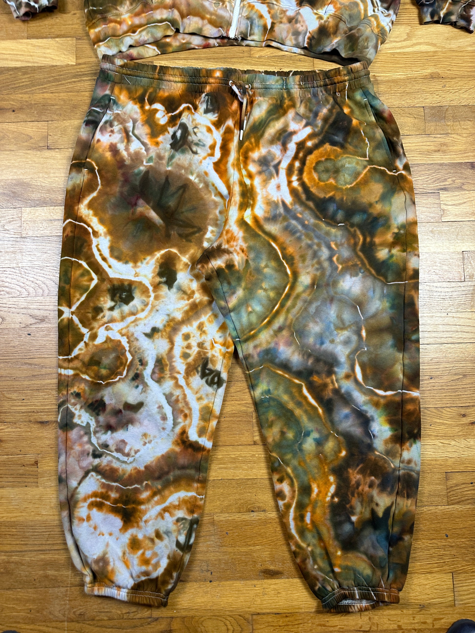 The pants have pockets, an adjustable drawstring/elastic waistband and a high waist.
