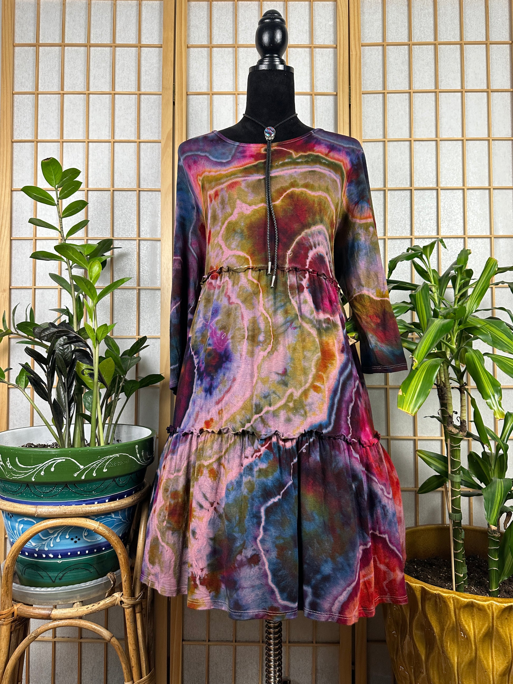 This dress is made of a stretchy rayon and it has a a tiered skirt that lands somewhere between the mid-thigh and the knee. This style runs pretty true to size